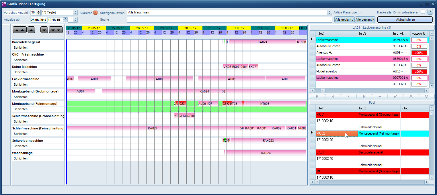 Die grafische Plantafel visualisiert nicht nur die nächsten Stunden, Tagen und Wochen der Planung, sondern übernimmt auch die Feinplanung der Arbeitsgänge. Manuelle Eingriffe sind natürlich möglich, aber im Normalfall plant das System vollautomatisch die notwendigen Arbeitsgänge auf Maschinen ein. Dabei wird pro Arbeitsgang ein Prioritätswert errechnet, anhand dessen die Einplanung erfolgt.